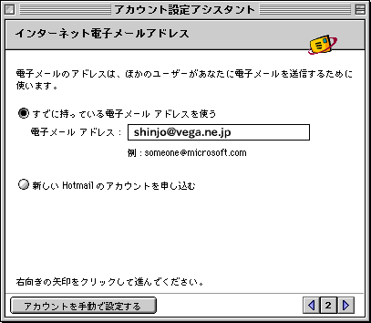 [送信メール(SMTP)サーバー] :「mail.vega.ne.jp」のように半角で入力します。 |