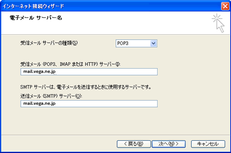 「mail.vega.ne.jp」と入力し、[次へ]をクリックします。 |