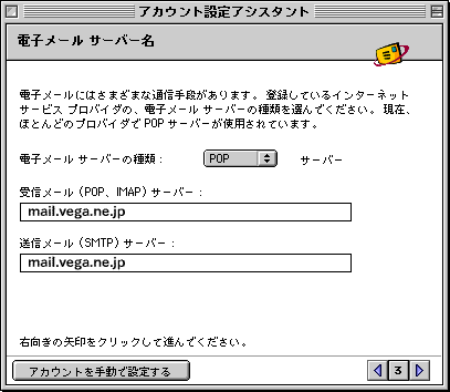 [送信メール(SMTP)サーバー] :「mail.vega.ne.jp」のように半角で入力します。 |
