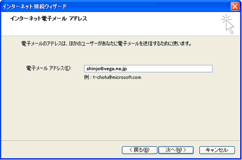 「mail.vega.ne.jp」と入力し、[次へ]をクリックします。 |